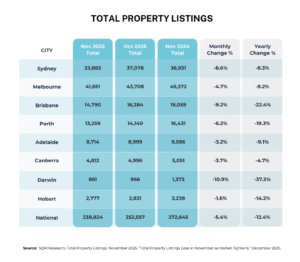 According to Cotality, Australia’s median property price rose 1.0% in November 2025 and 3.1% over the quarter. At the same time, SQM Research reports total listings fell 5.4% month-on-month, with new listings dropping a sharp 11.3%. Fewer properties are coming to market, and buyers are having to compete harder for what’s available.